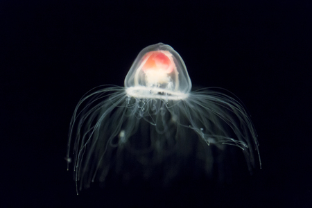 Marble jellyfish, lychnorhiza lucerna, in the dark water close up.
