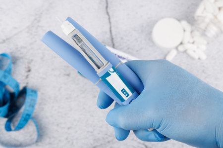 Medical flatlay of semaglutide pen in gloved hand, minimalist setting on concrete for clinical and treatment visuals