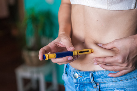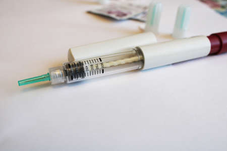 Injection syringe on a white table with spare needles in the background. Diabetes mellitus.