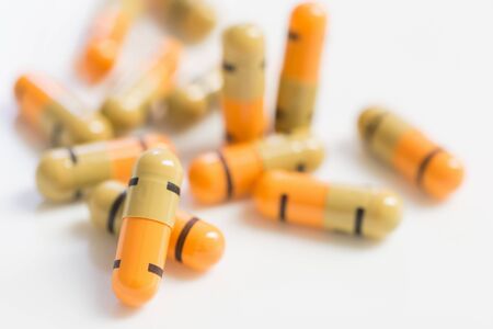 Selective focus on pink-white capsule pill fall down to white table. Antibiotic drug use with reasonable. Antibiotic drug resistance. Pharmaceutical industry. Antimicrobial drug market.