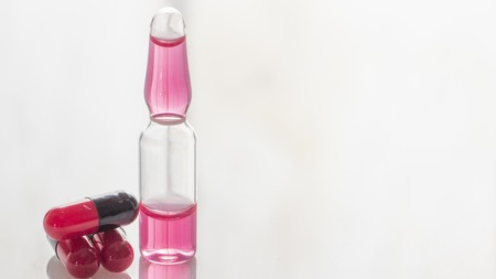 A lot of capsules and ampoules for injections on a burgundy background. Medetsinsky background, close-up