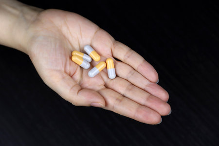 Hand of woman with pills on dark wooden table background. Medication in capsules, taking sedatives, antibiotics or vitamins