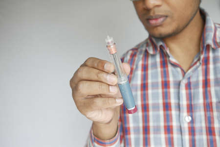 Man preparing insulin diabetic syringe for injection - people diabetic health care concept
