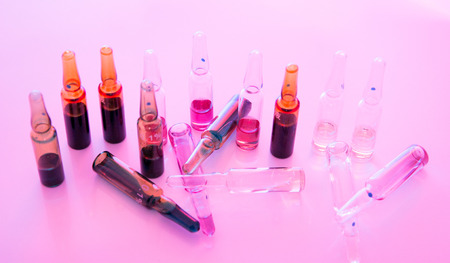 Abstract medical background, an ampoules with red liquid. A group of vaccine in bottles on a yellow background.