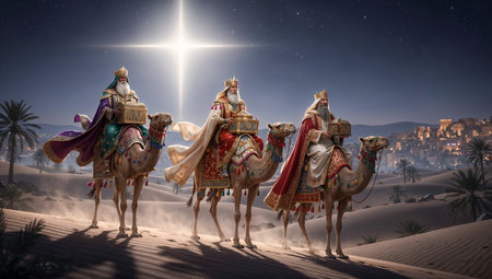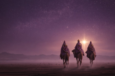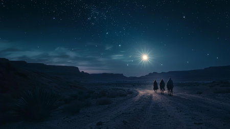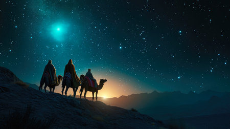 Under a vast night sky, three wise kings ride camels through a serene desert landscape, guided by the brilliant Star of Bethlehem, embodying hope and faith.