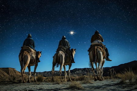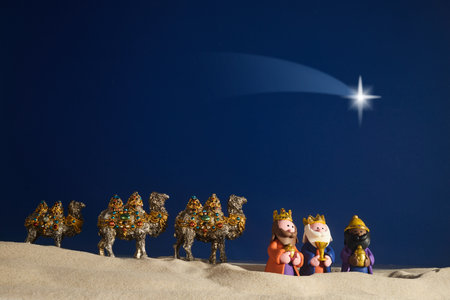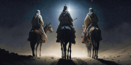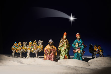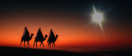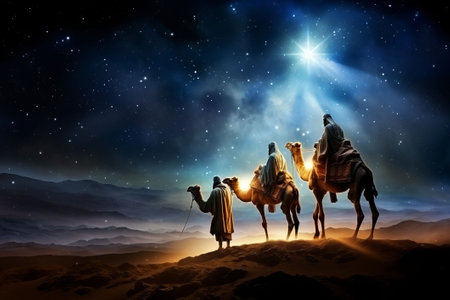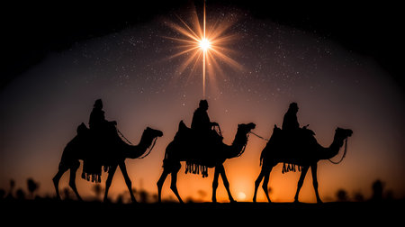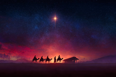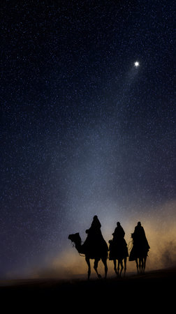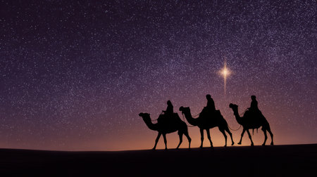 Three Kings and the guiding star against a backdrop of a clear and breathtaking night sky.three Wise Men silhouetted with room for copy.