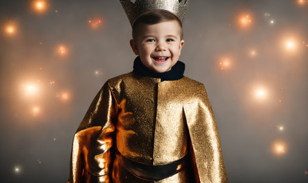 A young boy wearing a golden costume with a crown on his head.