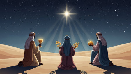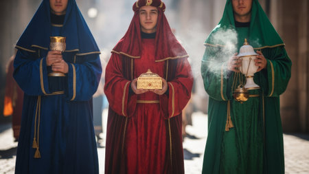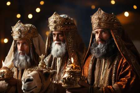 Three wise men holding gifts for Jesus. Concept for religious holiday of Epiphany, Nativity of Jesus, Three Kings Day, Christmas
