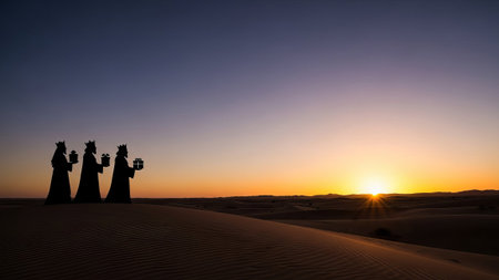 Three kings with gifts walk in desert dunes at sunset.