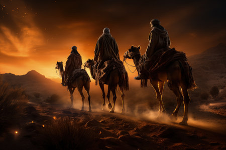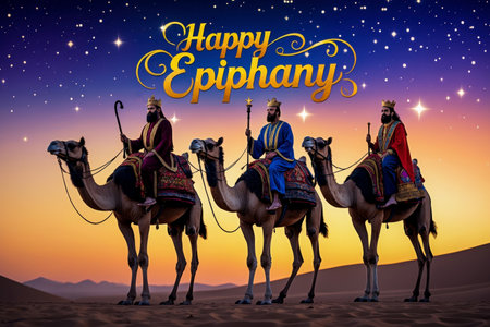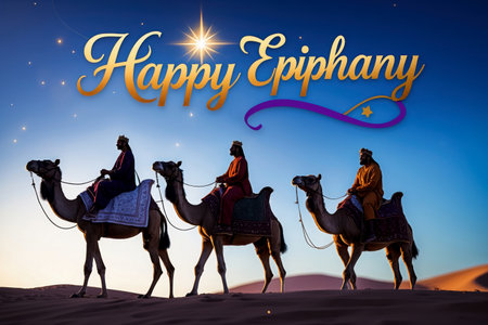 AI Generative Greeting card Christian holiday Epiphany, Three Wise Men ride camels through desert