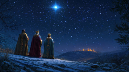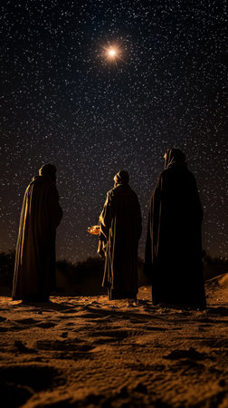 Three kings stand in awe, gazing at a bright star in a tranquil night sky. The serene landscape portrays a moment of reflection and wonder.