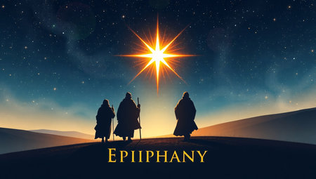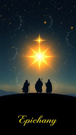 Vector illustration of Epiphany, a Christian festival. Jesus Christ soon after he was born. Abstract 3 kings looking at star in dark night background