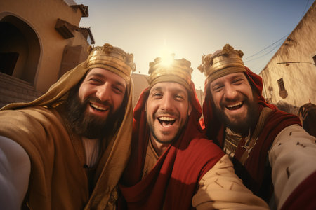 Three wise men taking a selfie together in Bethlehem on their journey to visit Jesus