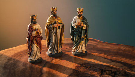 Three wise men figurines, Christmas decor, wooden surface, festive scene
