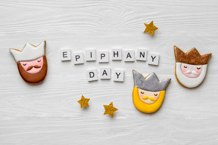 Happy Epiiphany day. Three wise man on white background of defocused golden lights.