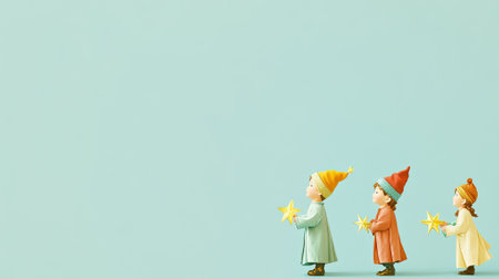 A cute image of kids dressed as wise men following a star, placed on a solid light blue background, with space at the bottom for a Christmas greeting. --ar 16:9 --v 6.1 Job ID: 920af2bb-edad-42ad-87cb-5ebfa68803d4