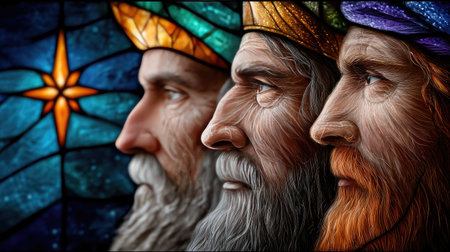 This stunning stained glass artwork features three wise men portrayed with exquisite detail, showcasing their distinctive facial features and colorful garments.