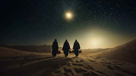 As twilight envelops the desert, three cloaked figures trek across the sandy landscape, their silhouettes illuminated by a radiant star above, creating a sense of peace and mystery.