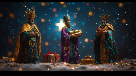 Amidst a shimmering backdrop, three regal figures embody the spirit of giving, each holding a unique gift. Their elaborate attire glimmers under twinkling lights, creating a magical atmosphere.