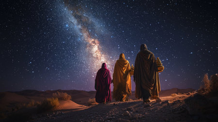 Under a star-studded sky, three individuals in vibrant robes traverse the sandy dunes, captivated by the stunning Milky Way above. The serene desert night envelops them in wonder.