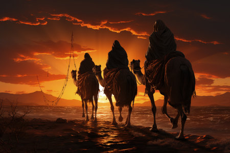 Three wise men on camels silhouetted against desert sunset with bright star in dramatic orange sky by Generative AI