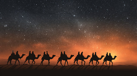 Majestic stars shine brightly above a stable in the desert, as three kings on camels journey towards the glowing star, heralding the arrival of baby Jesus.