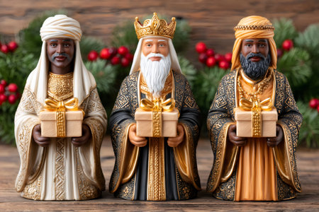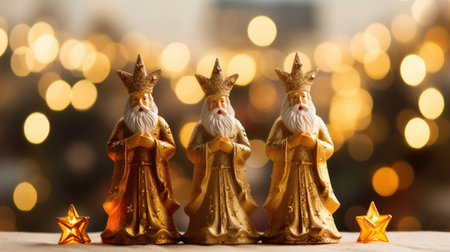 Capture the essence of celebration with three ornate king figurines set against a blurred festive background, symbolizing tradition and elegance in holiday decor.