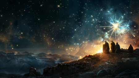 Three kings stand in awe, gazing at a bright star in a tranquil night sky. The serene landscape portrays a moment of reflection and wonder.