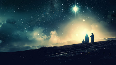 Silhouettes of Mary, Joseph, and baby Jesus stand on a hilltop, bathed in the golden glow of the Star of Bethlehem, a bright light in a sky filled with twinkling stars.