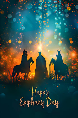 AI Generative Greeting card Christian holiday Epiphany, Three Wise Men ride camels through desert