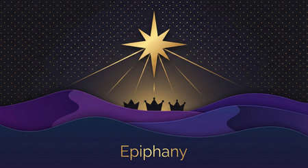 Vector illustration of Epiphany, a Christian festival. Jesus Christ soon after he was born. Abstract 3 kings looking at star in dark night background