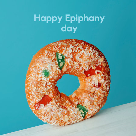 the text happy epiphany day and a roscon de reyes, the spanish king cake eaten traditionally on epiphany day, ornamented with glazed fruit, almond slices and sugar, standing on a white table