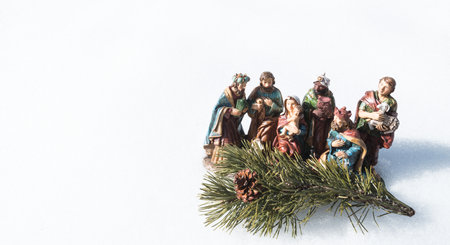 Nativity figures holy family with the three kings on white background with green coniferous tree