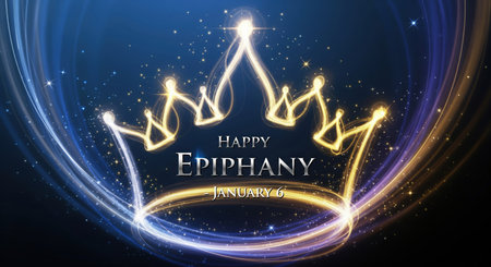 An abstract and luminous graphic for Happy Epiphany on January 6, featuring a glowing golden crown at the center. Swirling trails of blue and gold light surround the crown, interspersed with sparkling stars and glitter. The background is a deep blue, creating a sense of magic and celestial wonder.