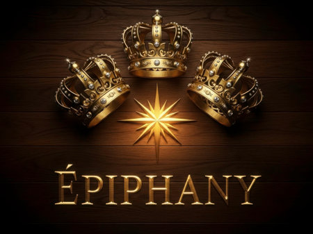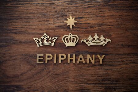 An image depicting three ornate crowns arranged in a triangular formation with a radiant star at the center. The word 'Epiphany' is written in elegant, golden letters at the bottom of the image.