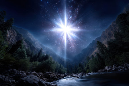 Bright star shines over a tranquil mountain valley with a river reflecting the cosmic glow.