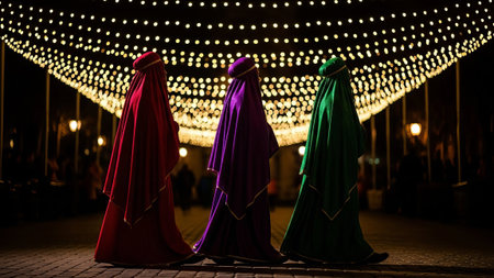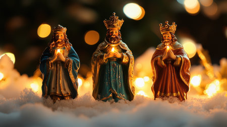 A captivating scene featuring three regal kings with crowns, beautifully illuminated by sparkling lights. Ideal for Christmas and holiday-themed projects.