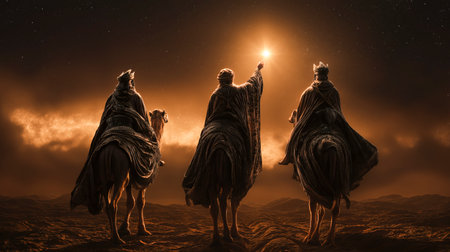 In a tranquil night, three wise men travel across a desert landscape, carrying gifts and gazing up at a bright star illuminating their path. The cosmic backdrop adds a mystical touch to their journey.