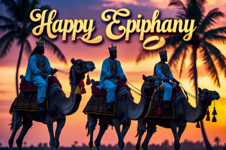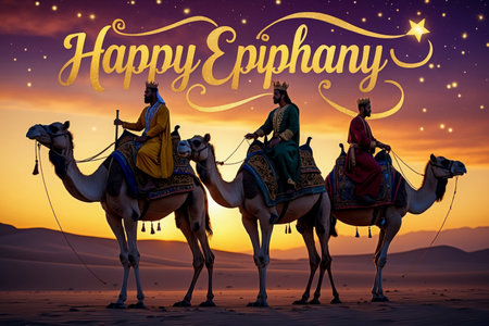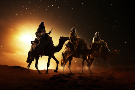 AI Generative Greeting card Christian holiday Epiphany, Three Wise Men ride camels through desert