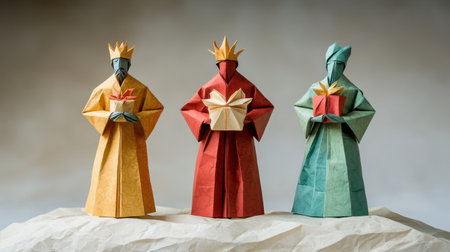 This captivating image features three intricately designed origami figures holding colorful gift boxes. The vibrant colors and unique designs enhance the festive atmosphere, making it an ideal representation of creativity and celebration.