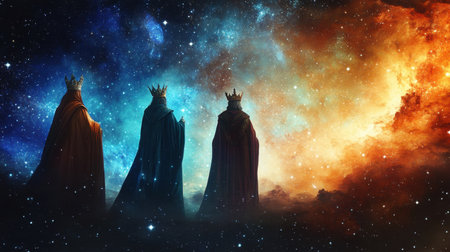 Three majestic kings stand silhouetted against a vibrant cosmic backdrop, embodying royalty and adventure in a breathtaking universe filled with color and mystery.