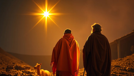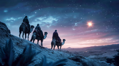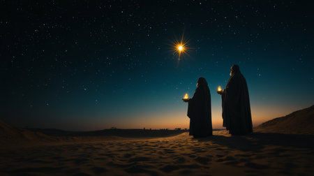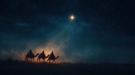 Three wise men travel through a serene desert at night, gazing towards the bright Star of Bethlehem illuminating the sky. The scene captures their quest under a celestial canopy.
