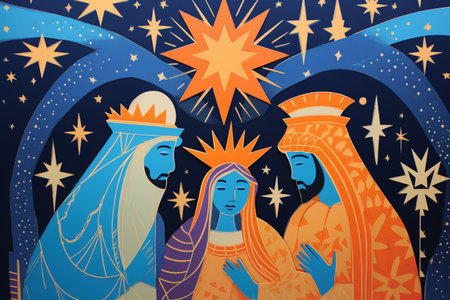 Illustrative representation of the Epiphany day with three wise men holding gifts and a star guiding them