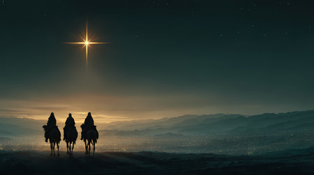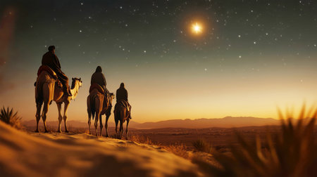 Under a vast night sky, three wise kings ride camels through a serene desert landscape, guided by the brilliant Star of Bethlehem, embodying hope and faith.