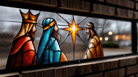 This stained glass artwork features three kings gazing upon a bright star, evoking a sense of serenity and spirituality, ideal for holiday themes.