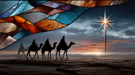 A stunning visual of the wise men traveling on camels at dusk, illuminated by a prominent star. The stained glass design adds a vibrant, artistic touch.