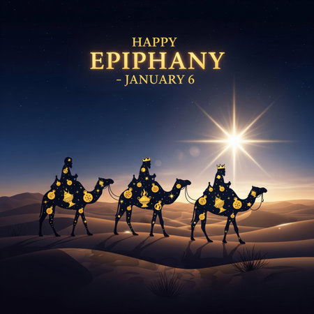 A striking depiction of the three wise men riding camels across a desert landscape under a starry night sky. The figures and camels are silhouetted, adorned with golden decorative elements representing gifts and crowns. A bright star shines prominently, guiding their journey, symbolizing the Epiphany celebration on January 6.