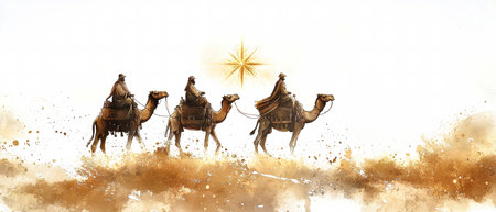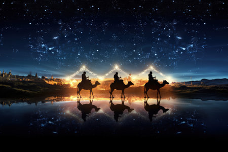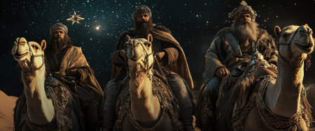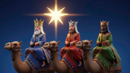 An illustration depicting three wise men, each riding a camel, following a bright star in the night sky. The wise men are dressed in royal attire with crowns, symbolizing their status as kings. The scene is set against a dark blue sky, emphasizing the guiding star.