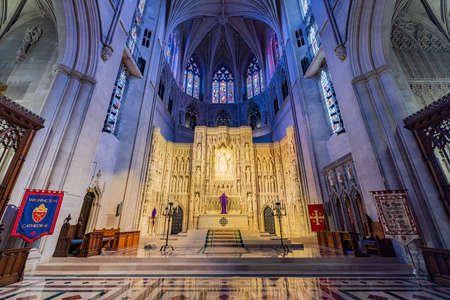Reims France September 21, 2020 View of stained glass windows inside the Basilica of Saint-Remi, a medieval abbey church in Reims, a historical monument in the Grand Est region of France