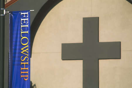 Word Church made with cement letters and cross on grey marble background. Copy space. Biblical, spiritual or christian reminder